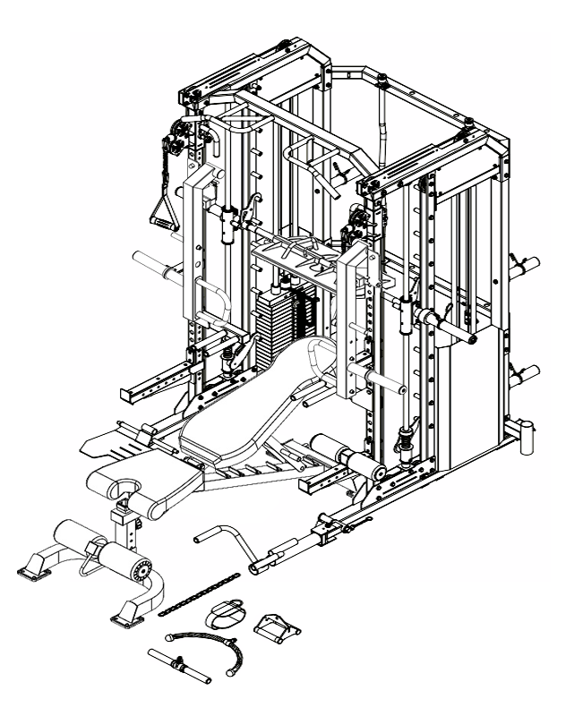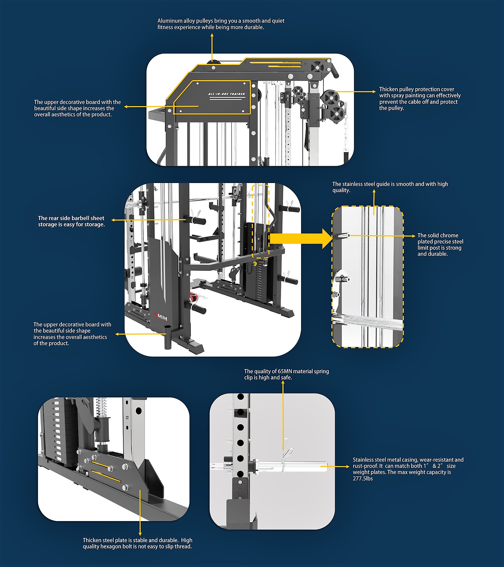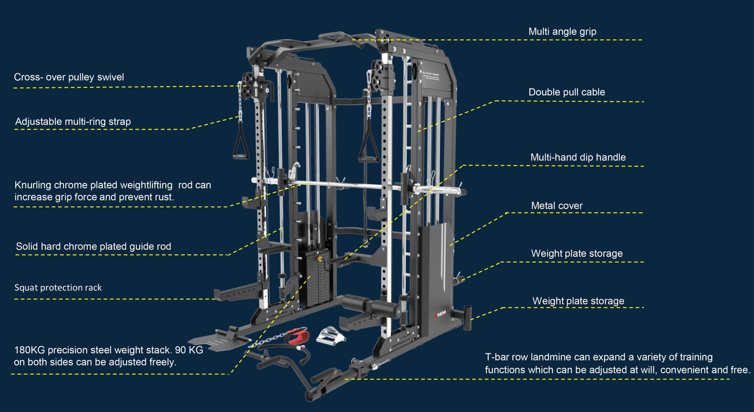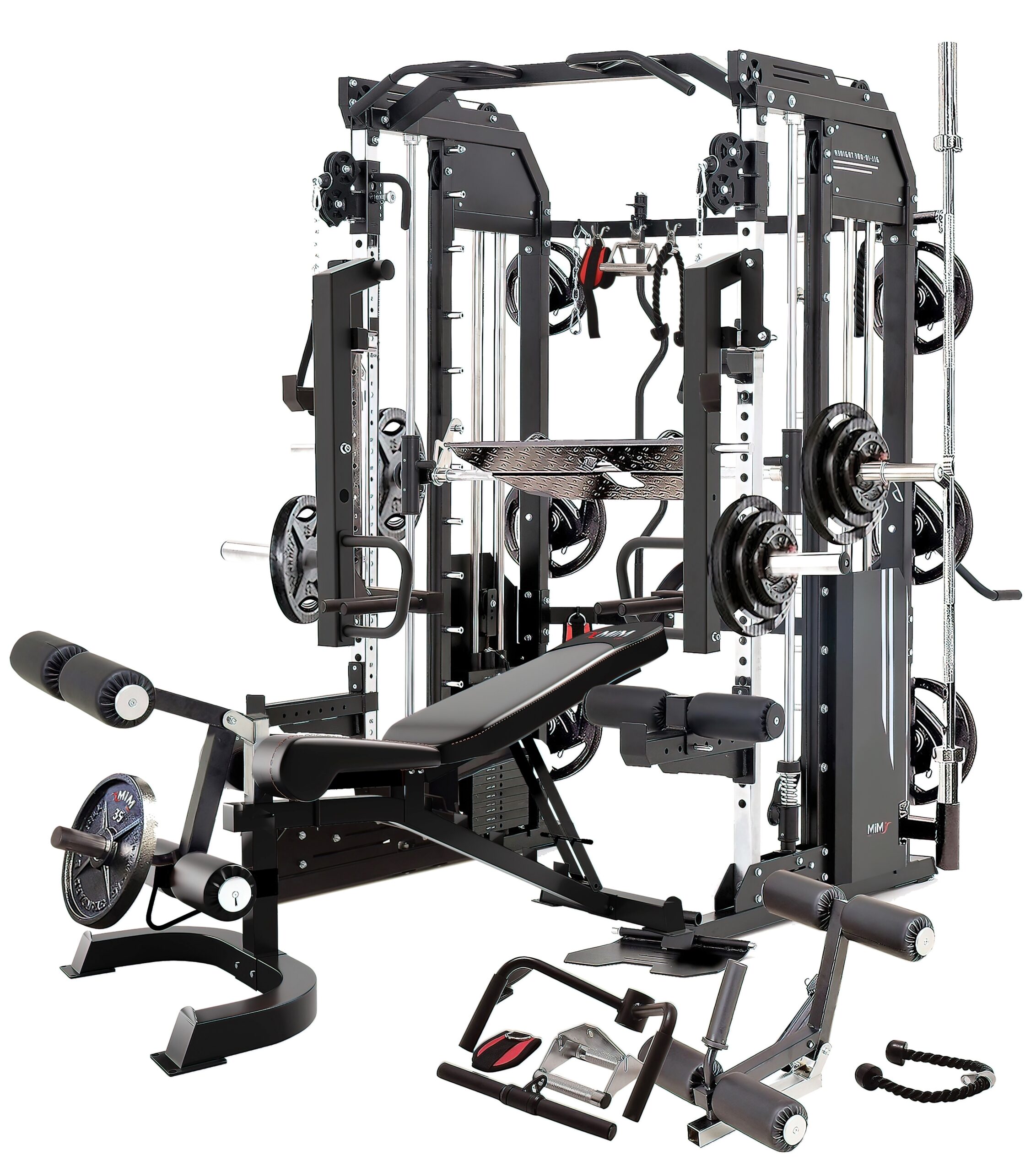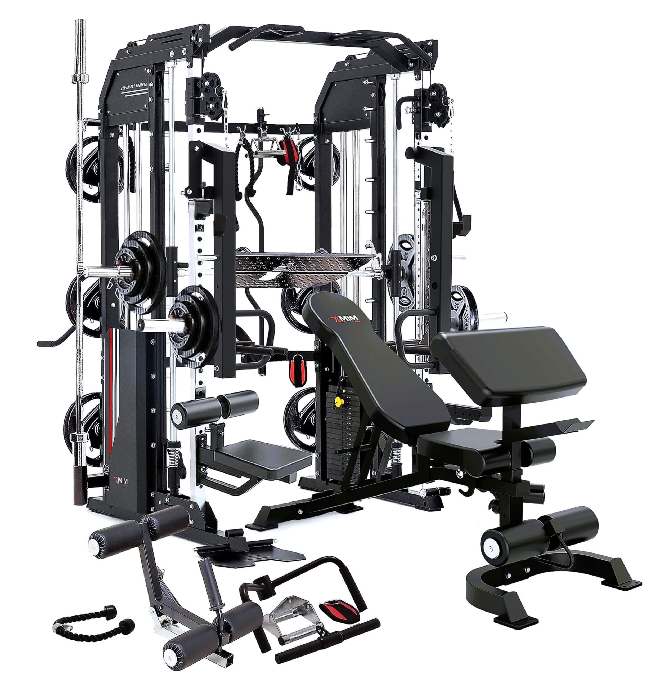 • THE MULTI-FUNCTIONAL COMMERCIAL GYM COMBO – Our MiM USA Hercules EX commercial smith machine gym equipment includes Functional Trainer, Power Cage, Vertical Leg Press, Dip & Chin up Station, Adjustable Weight Bench, Jammer Arms, Leg Extension, Preacher Curl, Lat Seat, 400 Lbs. Weight Stacks and 24 Accessories. A Complete Set of Strength Workout Solution comes complete with Solid Weight Rod, Copper Bushing, Cable Length, Hard Chrome Plated Sleeves, Barbell, Lat Bar, Straight, Curl Bar, Standard, and Olympic Bar Storage, Spring Clips, and Rubber Stopper for Smooth Slide.